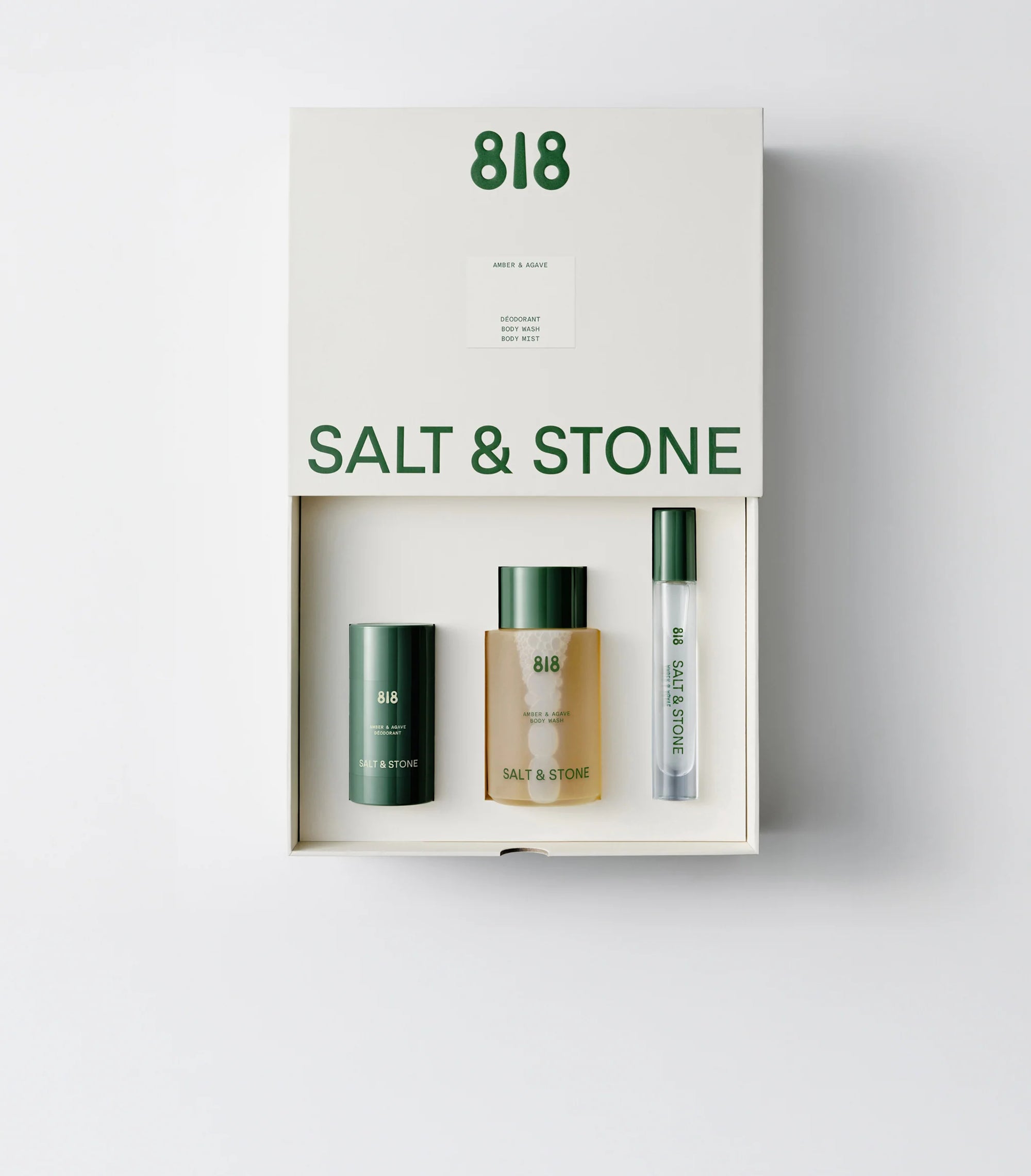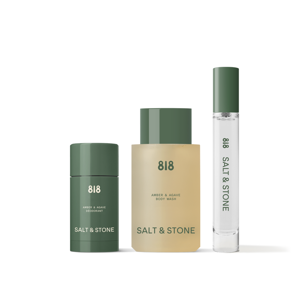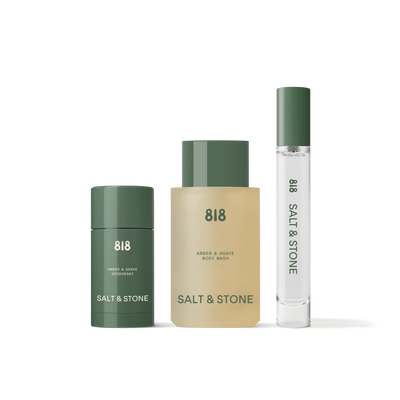 A travel-sized set in the sweet, golden scent of Amber & Agave—cleanse with body wash, get 48-hour protection with the deodorant, and amplify your scent with body mist.